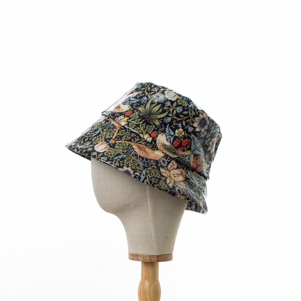 Rain Hat in licensed William Morris showerproof fabric. Blue ‘Strawberry Thief’ design on a dark blue background printed on cotton and coated with glossy PVC. Cotton lining. Canvas lined brim to adjust to your style. Wipe clean. Foldable for travel.