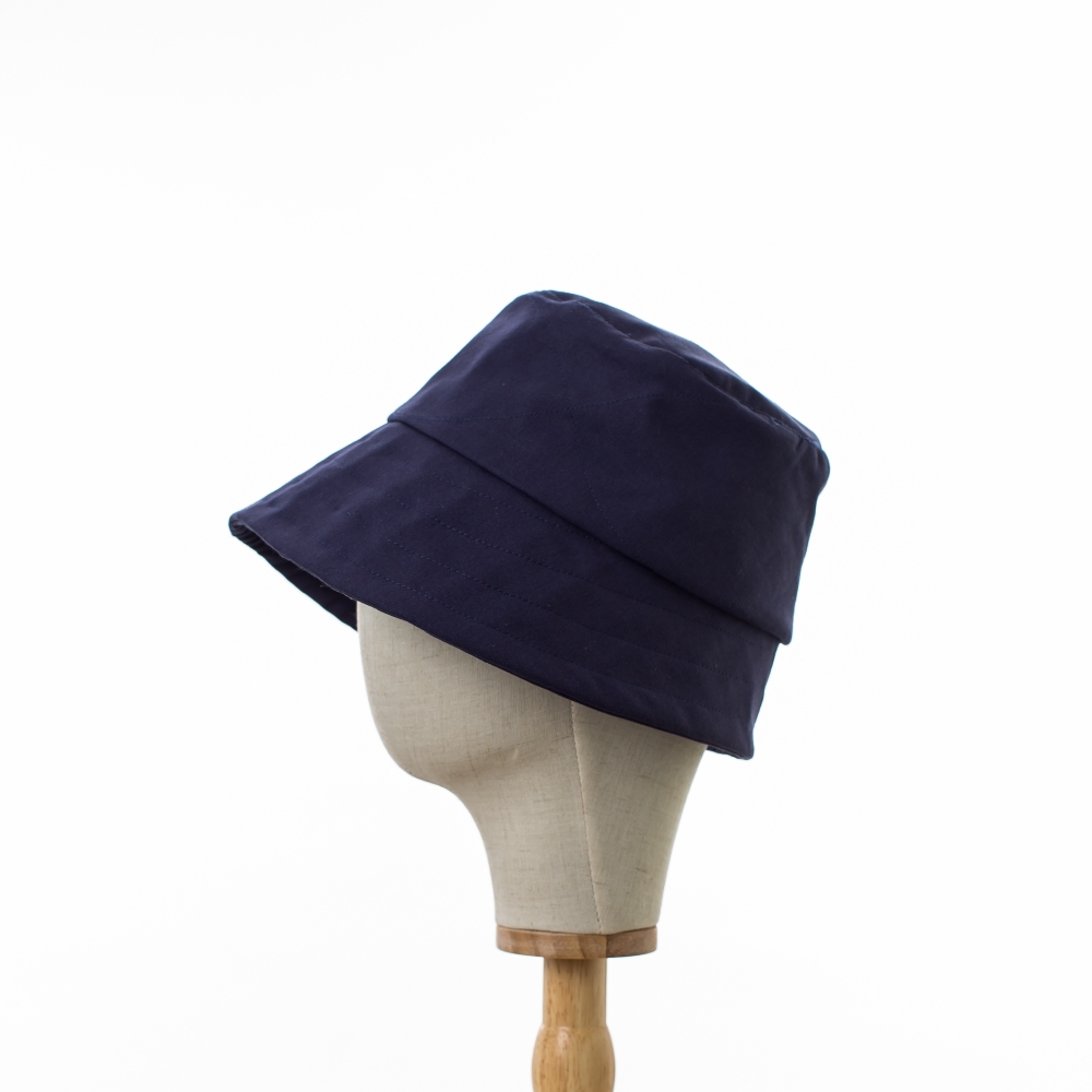 Chic Bayler & Co Bucket Hat made from 100% cotton navy drill fabric. Cotton lining. Canvas lined brim to adjust to your style. Foldable for travel. Machine wash cold. Hand made in the UK.