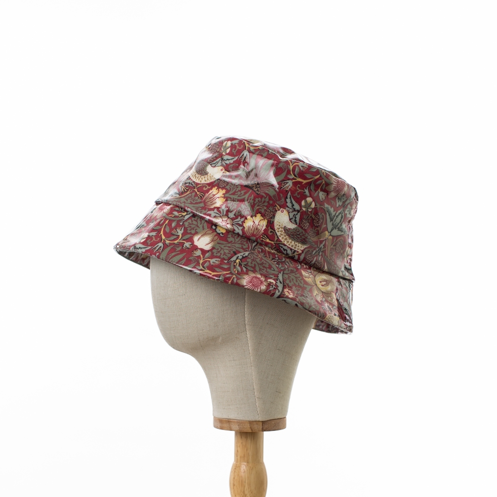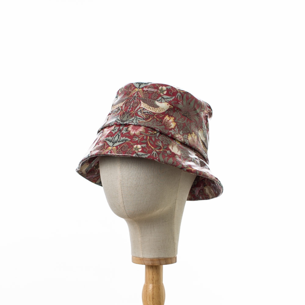Practical and Chic Bayler & Co Bucket Rain Hat in licensed William Morris showerproof fabric. Red ‘Strawberry Thief’ design on a deep red background printed on cotton coated with glossy PVC. Cotton lining. Canvas lined brim to adjust to your style. Wipe clean. Foldable for travel.